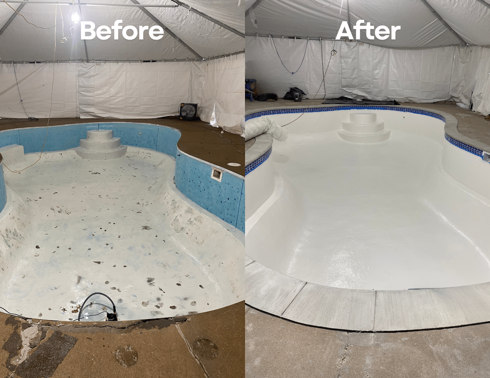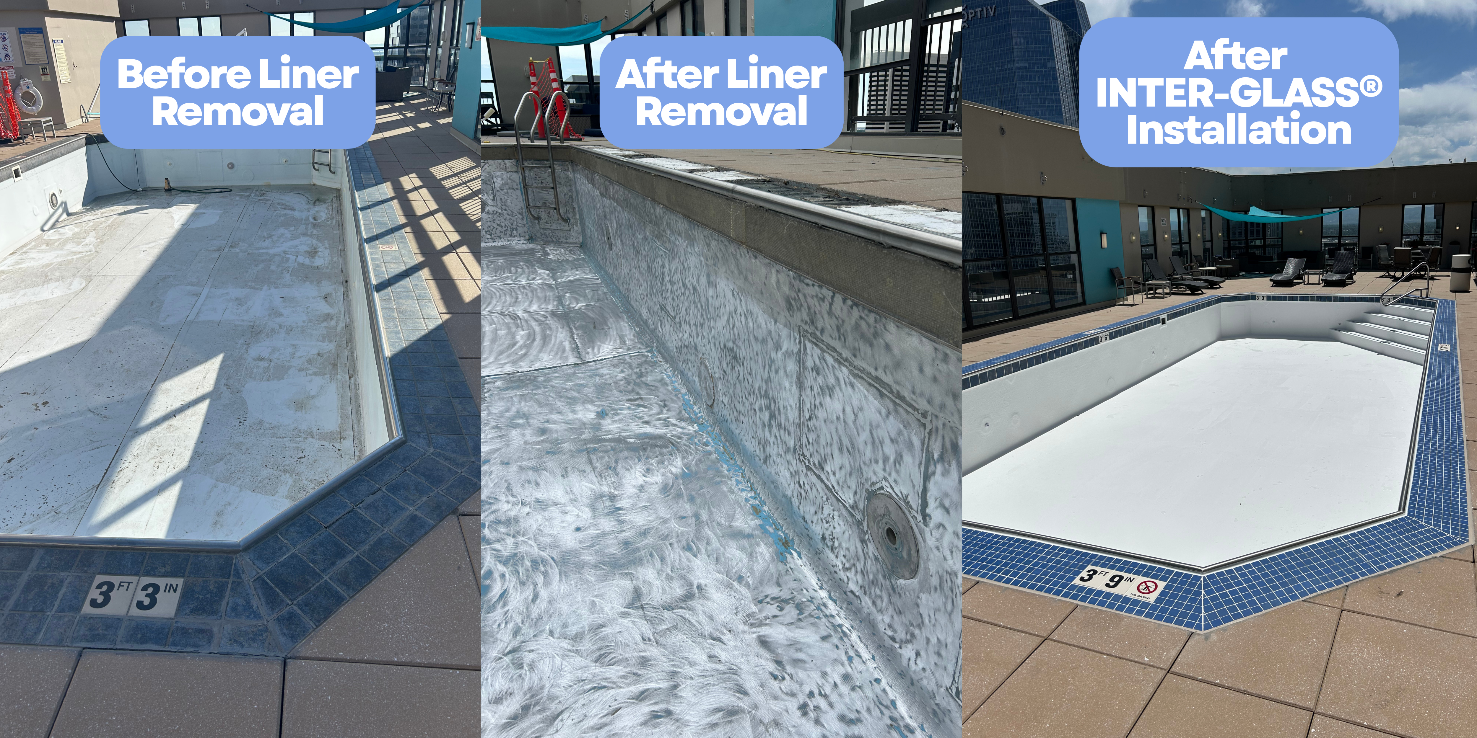 Before Liner RemovalWhether your pool is fiberglass, concrete or tile, INTER-GLASS® bonds right to it. That makes it the perfect renovation solution for older pools, custom-built designs, or even pools with mixed materials.